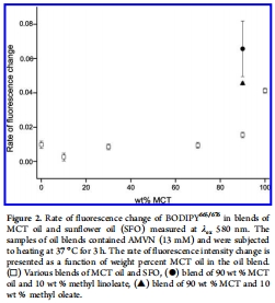 熒光強(qiáng)度變化:測量了BODIPY665/676在λ_ex 580 nm和675 nm處的熒光強(qiáng)度隨時間的變化。意義:直接量化了探針對自由基的響應(yīng)。數(shù)據(jù)顯示,在飽和MCT油中熒光變化(580 nm處增強(qiáng)約3000%)遠(yuǎn)大于在不飽和LSO中(增強(qiáng)約900%)(圖1)。在由AMVN引發(fā)的實驗中,SFO比例高的油混合物熒光變化速率低,而MCT油比例高時變化速率高(圖2)。這表明探針更容易被初始的、空間位阻小的自由基攻擊,而在不飽和油中,龐大的脂質(zhì)衍生自由基與探針的反應(yīng)因空間位阻而減弱。