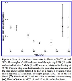 自旋加合物形成速率:通過ESR測量了以PBN為自旋陷阱時,不同油混合物中自旋加合物的初始形成速率。意義:評估了不同油混合物中自由基的總體水平。數(shù)據(jù)顯示,當(dāng)MCT油比例增至70%時,自旋加合物形成速率下降,但比例更高時(如純MCT油)速率又升高至與純SFO相似的水平(圖3)。這表明在低不飽和度油中,PBN能更有效地捕獲由AMVN產(chǎn)生的初始自由基。