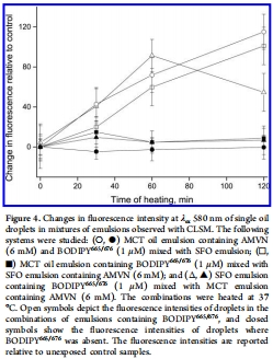 摘要指出,脂溶性自由基敏感性熒光探針BODIPY665/676可用于研究自由基驅(qū)動的脂質(zhì)自動氧化。研究發(fā)現(xiàn),在自由基引發(fā)劑存在下,該探針在飽和的中鏈甘油三酯油中的熒光變化比在多不飽和的亞麻籽油或葵花籽油中更顯著。這表明在飽和油中,探針作為唯一可氧化的物質(zhì)被自由基直接攻擊;而在不飽和油中,自由基會攻擊不飽和脂肪酸或探針,導(dǎo)致探針氧化速率較低。共聚焦顯微鏡研究結(jié)合乳液的氧氣消耗測量表明,自由基可以在油滴之間轉(zhuǎn)移,從而將自由基驅(qū)動的氧化反應(yīng)擴(kuò)散到相鄰的油滴。