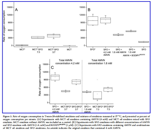 氧氣消耗速率:使用氧電極測量了乳液在37°C下的氧氣濃度隨時間下降的斜率。意義:從宏觀上反映了乳液體系的整體氧化程度。數(shù)據(jù)顯示,將含AMVN的MCT油乳液與不含AMVN的SFO乳液混合后,其耗氧速率甚至高于純SFO乳液(圖5A, B)。這宏觀地證明了位于MCT油滴中的自由基引發(fā)劑能夠引發(fā)并加速SFO油滴的氧化,支持了自由基跨油滴轉(zhuǎn)移的假說。