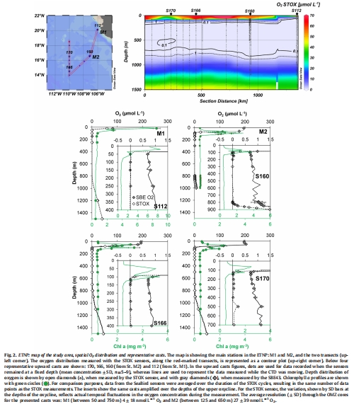 該論文摘要指出,研究使用高靈敏度的STOX O?傳感器,調(diào)查了東熱帶北太平洋和南太平洋氧氣最小區(qū)的原位氧氣分布,并通過實(shí)驗(yàn)室培養(yǎng)測定了這些區(qū)域不同深度水體的耗氧率。研究結(jié)果顯示,在兩個(gè)OMZ的核心區(qū)域,氧氣濃度普遍低于檢測限(幾個(gè)nmol L?1),表明東太平洋存在大量功能上缺氧的水體。在某些站位的深層二次葉綠素最大值處,氧氣常常無法被檢測到,而其他一些二次最大值處氧氣濃度可達(dá)約0.4 μmol L?1。在沿海水域的含氧表層和次表層,直接測得的呼吸速率很高,最高可達(dá)85 nmol L?1 O? h?1。在上部氧躍層深度,呼吸速率較低,在2到33 nmol L?1 O? h?1之間變化。在有二次葉綠素最大值的地方,呼吸速率高于其上方的含氧水體。在全玻璃容器中培養(yǎng)超過20小時(shí)會(huì)導(dǎo)致呼吸速率大幅增加。向上部氧躍層水樣中添加氨基酸,并未在最初20小時(shí)內(nèi)引起呼吸速率的顯著初始上升,這表明貧營養(yǎng)大洋水體呼吸速率的測量可能不受采樣過程中低水平有機(jī)污染的嚴(yán)重影響。測量結(jié)果表明,有氧代謝能在極低的氧氣濃度下有效進(jìn)行,其表觀半飽和濃度值在約10到200 nmol L?1之間。
