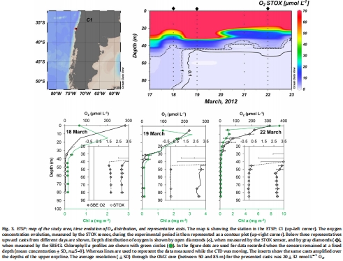 現(xiàn)場觀測:在ETNP(M1, M2站)和ETSP(C1站)的OMZ區(qū)域,利用搭載在CTD系統(tǒng)上的STOX傳感器單元進(jìn)行高分辨率原位氧剖面測量,以確定水體中氧氣的精確分布(特別是核心缺氧區(qū))。