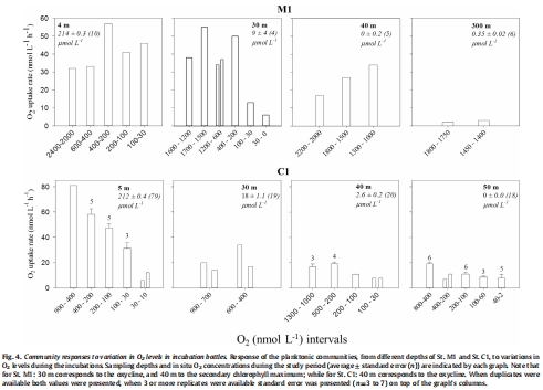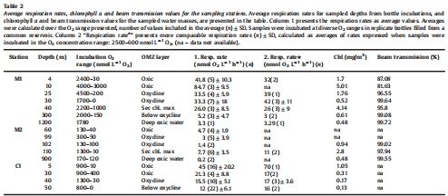 社區(qū)呼吸速率:測量了不同深度和站位的耗氧率。呼吸速率在生產(chǎn)力較高的近岸站(M1, C1)的含氧表層最高(如C1站5米深處達(dá)70 nmol L?1 h?1),在遠(yuǎn)洋站(M2)和深水區(qū)較低。在氧躍層和緊鄰氧躍層下方的原位缺氧水體中,仍檢測到顯著的潛在呼吸速率(2-33 nmol L?1 h?1)。意義:量化了OMZ及周邊水體微生物有氧代謝的強(qiáng)度,表明微生物即使長期處于缺氧環(huán)境,仍保有立即利用極低濃度氧氣進(jìn)行呼吸的代謝潛力,這對(duì)理解碳循環(huán)和氧氣消耗至關(guān)重要。數(shù)據(jù)匯總于表2,部分站在圖4中以圖示展示耗氧率隨氧氣濃度的變化。
