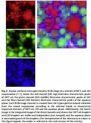 脂滴物理狀態:拉曼光譜成像顯示,在混合蛋黃醬中,代表MCT油和LSO的特征信號區域(紅色和綠色)基本獨立分布,盡管存在一些重疊區域。意義:直接證明混合蛋黃醬中大部分MCT和LSO油滴在物理混合后內容物沒有發生交換,保持獨立。這排除了油滴間物質交換導致穩定性變化的簡單解釋,是理解后續化學數據的基礎。數據來自圖2及其文字描述。