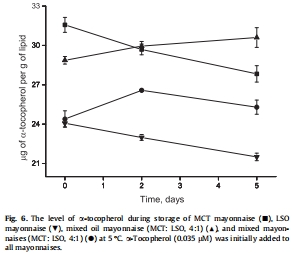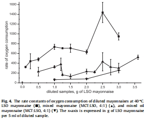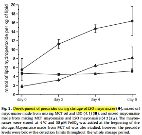 與純LSO蛋黃醬相比,混合蛋黃醬和混合油蛋黃醬的氧化穩定性更高(表現為更低的過氧化物形成、更低的氧氣消耗速率以及α-生育酚的穩定)。