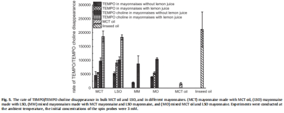 自由基形成速率:水溶性自旋探針(TEMPO choline)的衰變速率在四種蛋黃醬中相似。意義:表明初始自由基在水相中的生成速率與油滴類型無關,氧化起始點相同。脂溶性探針(TEMPO)的衰變在混合系統中較慢。意義:提示在混合系統的油相中,烷基自由基的濃度可能較低。數據來自第3.3.3節、圖5及相關文字。