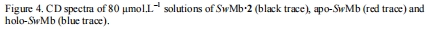 圓二色譜特征:SwMb·1和SwMb·2在190-200 nm區域出現了與holo-SwMb類似的信號,而apo-SwMb無此信號。意義:該信號被認為是His93配位誘導的局部蛋白質折疊特征。其出現強有力地支持了鈷肟通過His93與蛋白軸向配位的結論。數據來自圖4。