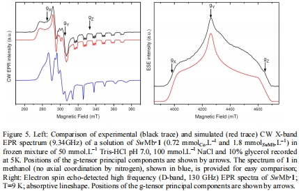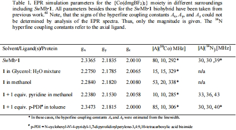 電子順磁共振參數:SwMb·1的X波段和D波段EPR譜顯示典型的低自旋Co(II)特征,并觀察到來自1?N的超精細耦合(顯示單個軸向氮配體)。其g張量和超精細耦合常數與在甲苯等疏水環境中、具有吡啶類軸向配體的鈷肟加合物相似。SwMb·2為EPR沉默。意義:直接證明了SwMb·1中Co(II)的軸向配體是一個組氨酸氮原子;g值分析表明鈷肟處于高度疏水的蛋白質微環境中。SwMb·2的沉默狀態與Co(III)氧化態一致。數據來自圖5、表1。