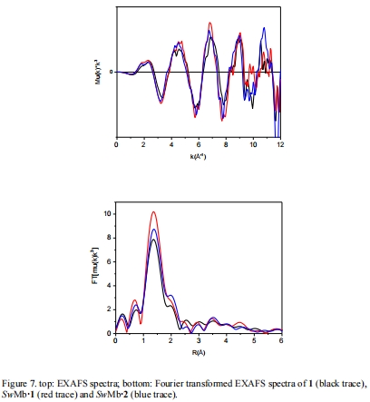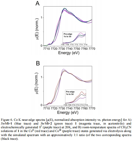 XANES:SwMb·1和SwMb·2的鈷K邊吸收邊相對于自由Co(II)配合物1發生藍移,但比模型Co(III)物種能量低,模擬分析表明樣品中Co(II)和Co(III)物種各占約50%。意義:揭示了生物雜化物樣品中鈷處于混合氧化態,這與EPR結果(僅約36% Co(II))相互印證。數據來自圖6。