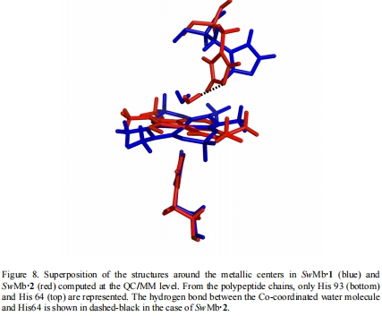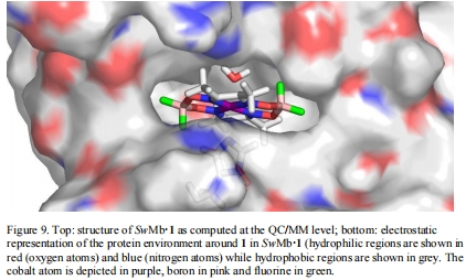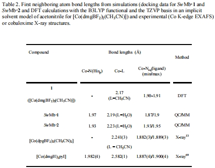 理論對接結構:QC/MM計算顯示,兩種鈷肟都優先與His93配位,并在其反位有一個水分子完成八面體配位。SwMb·2中,配位水分子與His64形成氫鍵。意義:從理論上預測了生物雜化物最穩定的結合模式與局部結構,與EXAFS推斷的六配位結構以及EPR推斷的疏水環境相符。數據來自圖8、圖9、表2。
