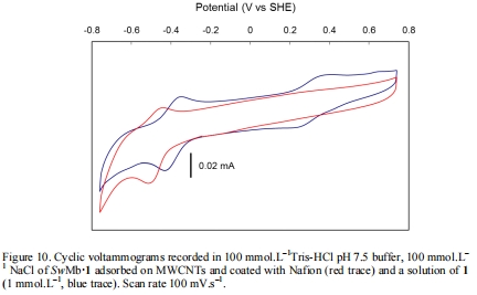 電化學表征:將生物雜化物吸附到多壁碳納米管修飾電極上,測量其循環伏安曲線,研究其氧化還原性質。