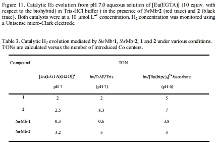催化產氫性能:在不同條件(化學還原、光催化)下測量H?產量。例如,SwMb·2在pH 7.0,使用Eu(II)還原劑時,產生3.2 TON(轉換數),略優于自由配合物2(2.5 TON)。SwMb·1在相同條件下活性較低(0.3 TON),但在pH 6.0的光催化體系中活性提高至3.8 TON。意義:直接證明了兩種鈷肟基生物雜化物在近中性水溶液中具有催化產氫活性,實現了構建“人工氫化酶”的目標。同時揭示了不同鈷肟骨架和蛋白質環境的相互作用對催化效率的影響。數據來自圖11、表3。