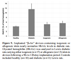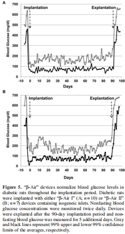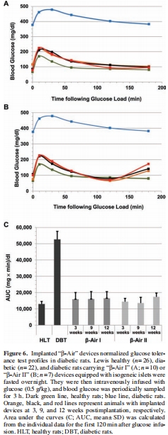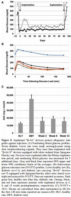 在糖尿病大鼠模型中,該裝置能夠長期(長達6個月)維持正常的空腹和餐后血糖水平,并正?;疕bA1c,其效果不依賴于免疫抑制劑,且對同種異體胰島同樣有效。