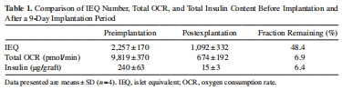 氧氣消耗率:測量了植入前、后胰島的OCR。數據顯示,在不供氧條件下植入9天后,胰島總OCR喪失了93%以上(表1)。意義:量化了缺氧導致的胰島代謝活性急劇下降,與功能喪失相符。