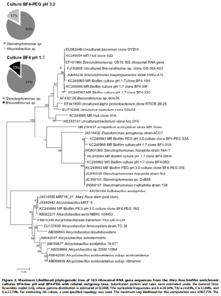 樣品與富集:從支撐船體的駁船甲板上的PEG浸潤生物膜取樣,富集得到嗜酸鐵/硫氧化微生物培養物(BF4 pH 1.7)。