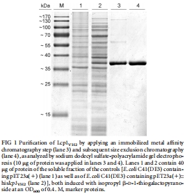 蛋白制備:從菌株VH2中克隆lcp1VH2基因,通過基因工程方法(替換信號肽、添加組氨酸標簽)在大腸桿菌中實現(xiàn)可溶性異源表達,并利用固定化金屬親和色譜與尺寸排阻色譜兩步法純化得到均一蛋白。
