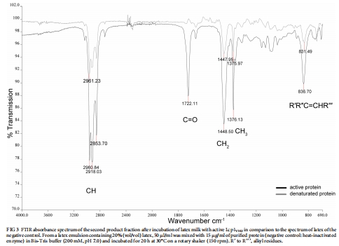 將純化的Lcp1VH2與天然橡膠膠乳或合成橡膠顆粒孵育,提取產(chǎn)物,利用傅里葉變換紅外光譜、核磁共振波譜等技術(shù)分析降解產(chǎn)物的化學結(jié)構(gòu),確定裂解位點和末端官能團。