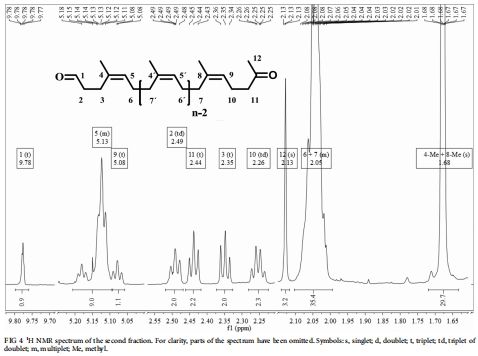 產(chǎn)物鏈長:通過對NMR信號積分估算,分離得到兩組產(chǎn)物的平均異戊二烯單元數(shù)(n)分別為~18和~10。意義:表明裂解是內(nèi)切型的,即從聚合物鏈內(nèi)部隨機位點進行切割,產(chǎn)生不同長度的寡聚物片段。數(shù)據(jù)來自“結(jié)果”部分“Analysis of degradation products via spectral analyses”的文字描述及補充表S1。