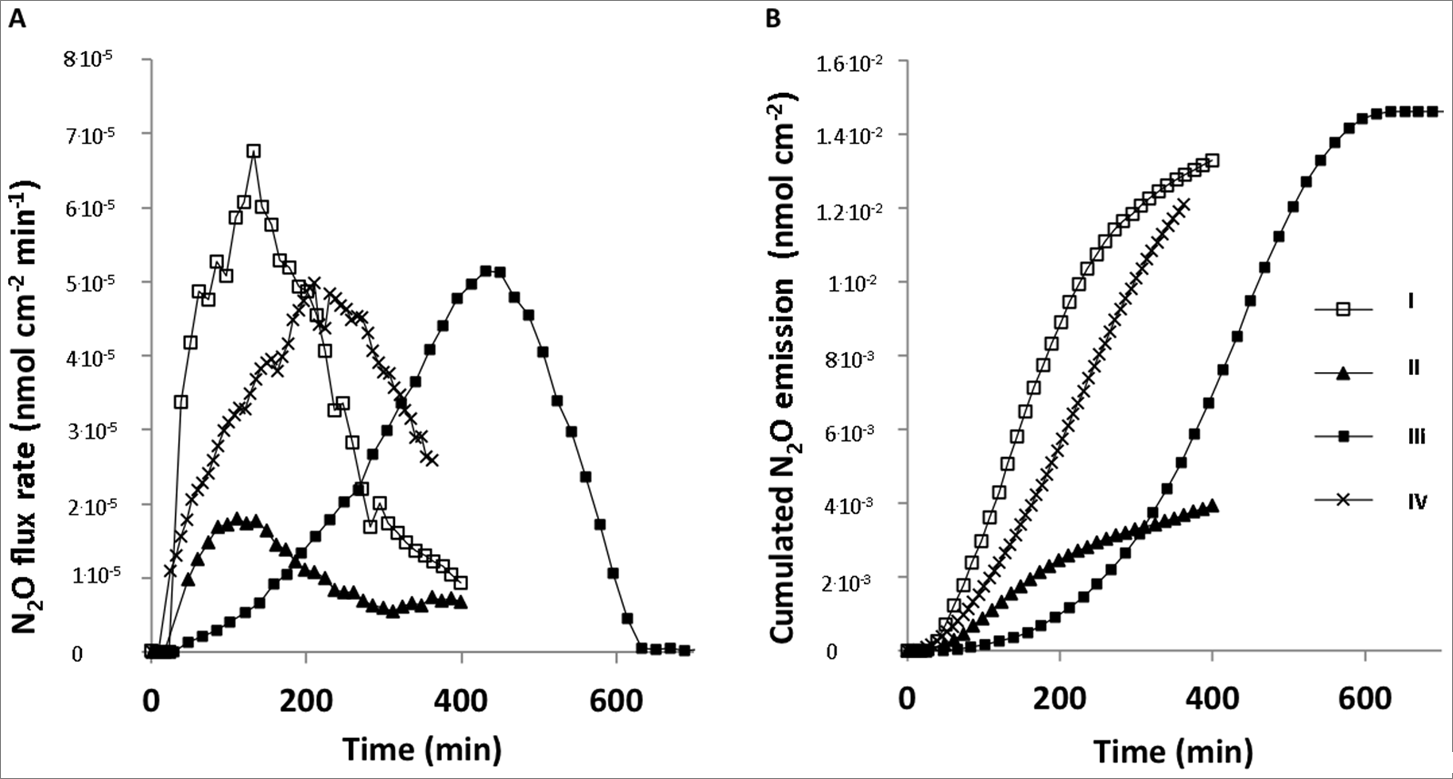 圖5、從痰標本中累積N2O的流出和排放。圖A表示的是積累和排放的氧化亞氮的微剖面圖(n=4),計算出囊性纖維化患者痰液樣品中N2O流出率,圖B表示的是基于N2O微剖面圖(n=4)計算出的N2O排放率,I、II、III和IV分別代表4種不同的痰液樣本。