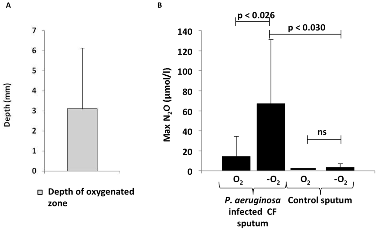 圖2、痰液體系中的氧氣和氧化亞氮分配情況。圖A表示的是慢性假單胞菌肺感染型囊性纖維化患者痰標本中含氧區(qū)域的深度。圖B表示的是慢性假單胞菌肺感染型囊性纖維化患者痰(n=8)標本中好氧區(qū)和缺氧區(qū)中N2O的最大濃度(n=8),對比組采用兩名PCD患者和一名CF患者,患者肺部沒有感染慢性假單胞菌。