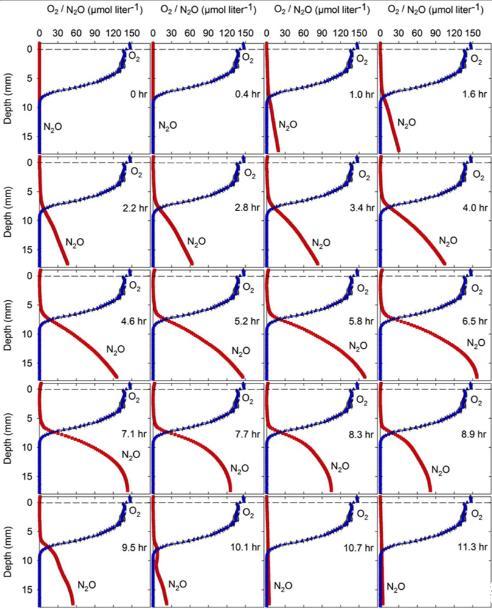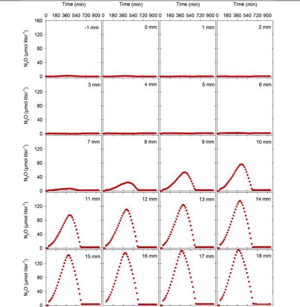 圖4、痰液樣本中不同深度的N2O的生產和消耗速率。從圖中可以看出,相同的痰液樣本中,N2O濃度與時間的深度特異性圖。在痰液樣本中所有深度中,N2O的凈產量都是大約6小時后被觀察到,其次是N2O的凈消耗,大概是在6 h左右的發(fā)現了硝酸鹽的消耗。