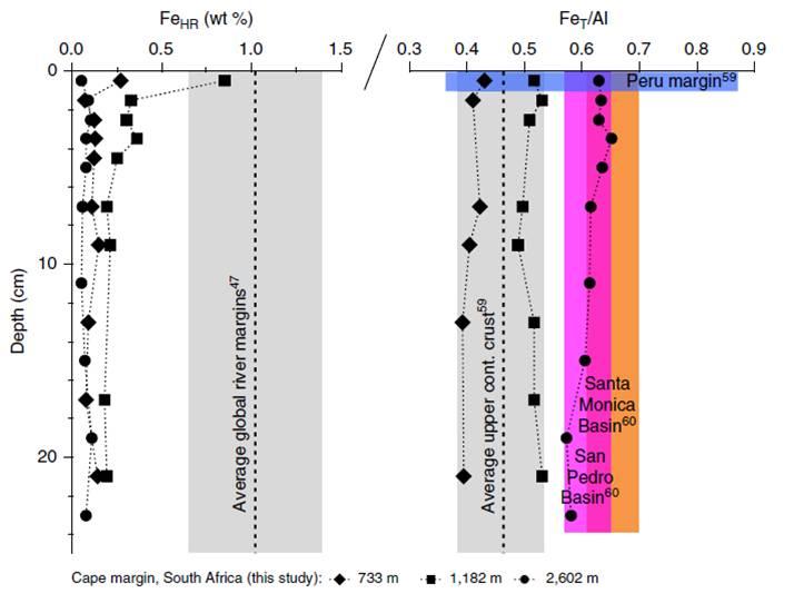 圖2、海角邊緣沉積物中鐵元素豐都的分布。其中圖A表示的是在非洲南部大陸海洋邊緣中高活性的鐵的含量,圖B表示的是鐵相對于鋁的含量比例分布情況。其中黑色菱形表示的是所取沉積物的深度是733米、黑色正方形標示指的是所取沉積物的深度為1182米,實心圓圈圖表示的是所取沉積物深度為2602米。