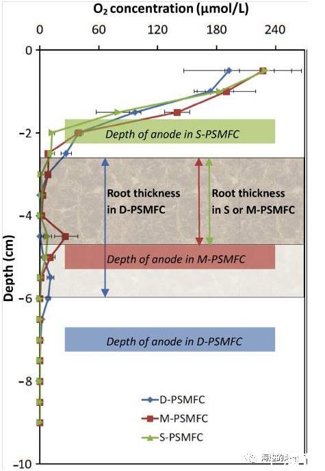 微電極的應用介紹:采用氧氣微電極傳感器(unisense微電極分析系統)測定了PSMFCs體系砂中氧的濃度分布剖面。研究發現植物根系可以釋放氧氣,在沙中氧氣梯度的驅動下向上和向下輸送,形成根際微氧環境。對植物沉積物微生物燃料電池(DPSMFCs、M-PSMFCs,S-PSMFCs)的微剖面進行分析,從水沙界面處到沙土下-3.5cm或4.0cm處,氧的濃度明顯降低到接近于零,而沙土表面更深處(-5.0cm—7.0cm)能觀察到明顯的氧損失帶,距離沙土表面5cm處對應的氧的最大濃度為10.8umol/L。這些研究數據表明,當將陽極置于根的下方,并保持適當的距離,使PSMFCs能夠利用根源有機物,可以很好的避免氧損失的負面影響。此研究表明一定的氧損傷可以控制植物沉積物微生物燃料電池(PSMFC)發電的晝夜節律。