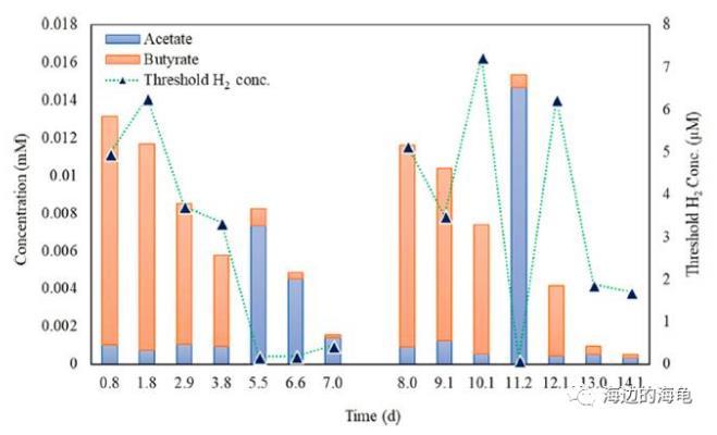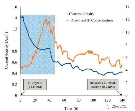 微電極測試燃料生物電池中體系中正丁酸發酵至醋酸生成的氫氣的濃度隨時間的變化情況