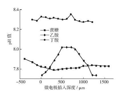 R2反應(yīng)器(底物乙酸)中顆粒污泥采用不同測試底物時(shí)內(nèi)部pH值梯度