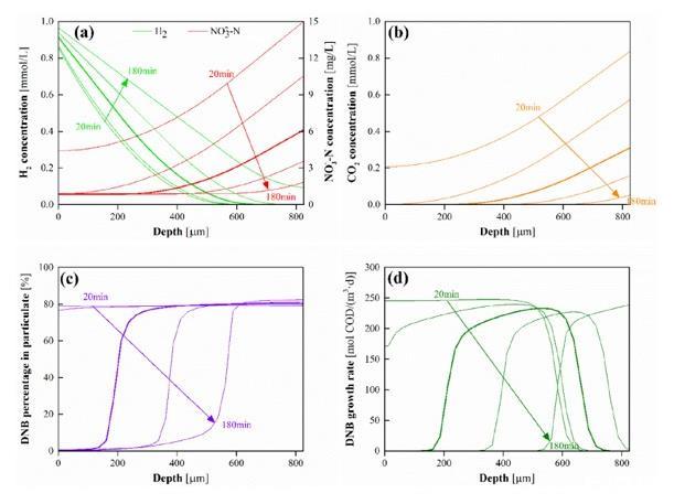 圖2、(a)電子供體(H 2)和受體(NO 3-)分布、(b)CO 2分布、(c)DNB在顆粒成分中的分?jǐn)?shù)和(d)DNB沿深度方向的生長(zhǎng)速率的模型評(píng)估系統(tǒng)的生物膜作為HRT的函數(shù),范圍從20到180分鐘(場(chǎng)景E2)。模擬條件:生物膜厚度=825μm,本體液體pH=7.5,H 2壓力=5 psig,CO 2添加量=50 mg/L,進(jìn)水NO 3-和SO4 2-濃度分別為20 mg N/L和20 mg分別為S/L。X軸的零點(diǎn)為膜側(cè),深度為離膜側(cè)的距離。