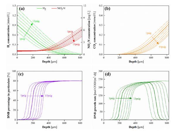圖3、(a)電子供體(H 2)和受體(NO 3-)分布、(b)CO 2分布、(c)DNB在顆粒成分中的分?jǐn)?shù)和(d)DNB沿深度方向的生長(zhǎng)速率的模型評(píng)估系統(tǒng)的生物膜作為H 2壓力的函數(shù),范圍為1至15 psig(方案E3)。模擬條件:生物膜厚度=825μm,本體液體pH=7.5,HRT=80 min,CO 2添加量=50 mg/L,進(jìn)水NO 3-和SO 4 2-濃度分別為20 mg N/L和20 mg S/L。X軸的零點(diǎn)為膜側(cè),深度為離膜側(cè)的距離。