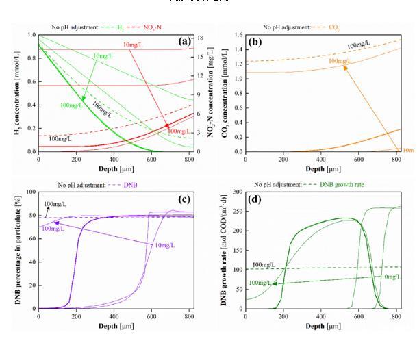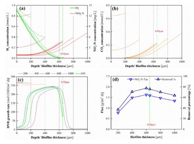圖5、(a)H 2和NO 3-和(b)CO 2曲線的模型評(píng)估,(c)DNB沿生物膜深度的生長(zhǎng)速率,以及(d)NO3-系統(tǒng)的去除通量作為生物膜的函數(shù)厚度范圍從200到1000μm。模擬條件:本體液體pH=7.5,H 2壓力=5 psig,HRT=80 min,CO 2添加量=50 mg/L,進(jìn)水NO 3-和SO 4 2-濃度分別為20 mg N/L和20 mg S/L。X軸的零點(diǎn)為膜側(cè),深度為離膜側(cè)的距離。圖9d比較了不同生物膜厚度下的NO3-去除通量,結(jié)果顯示生物膜厚度為600μm時(shí)的反硝化率最高。