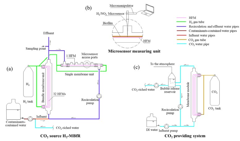 圖1、CO 2源H2-MBfR設(shè)置的示意圖。該系統(tǒng)由三部分組成:(a)H 2-MBfR:綠線表示H2氣管,而藍(lán)色、紅色和深紅色線是水管。(b)組裝在帶有內(nèi)置單HFM的水平玻璃流通池端口上的微傳感器測(cè)量單元的細(xì)節(jié)。(c)CO2供給系統(tǒng):青色線代表富含CO2的水,棕色線代表CO 2氣管。