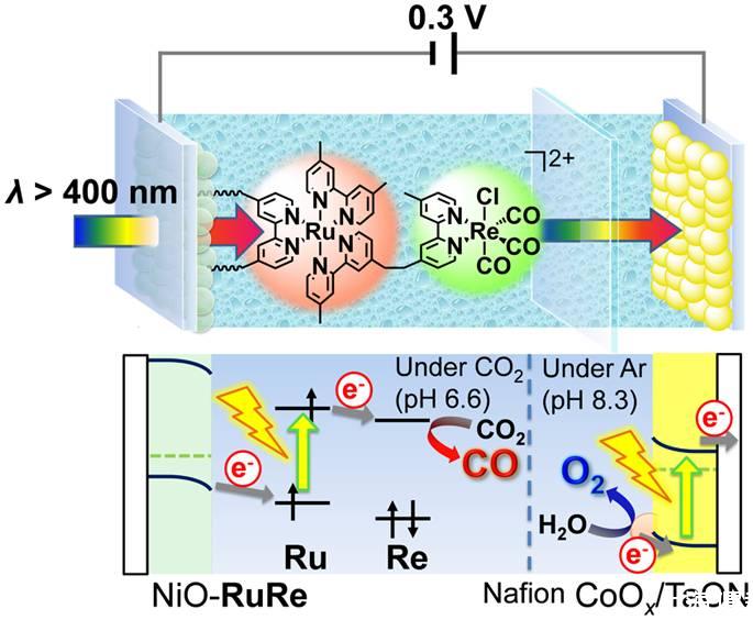 開發了一種NiO-RuRe混合光電陰極對二氧化碳進行光電還原,并且結合使用CoOX/TaON光電陽極構建光電化學電池來驅動水的氧化。該光化學電池在水溶液中應用可見光在NiO-RuRe材質的陰極上高效的催化生成一氧化碳,這表明該光化學電池能夠應用可見光實現對于二氧化碳的還原以及水的氧化生成一氧化碳和氧氣。