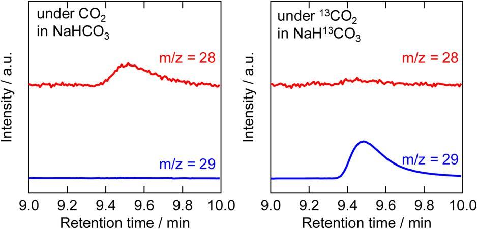 圖3、使用GC-MS氣相氣相色譜分析光催化電解水過程中產生的CO的過程,其中左右兩圖的區別一個是使用常規的CO2和NaHCO3、另一個是使用了13CO2/Na13CO3,因此可以看出,體系中的一氧化碳的生成主要是通過還原二氧化碳獲得而不是還原NaHCO3.