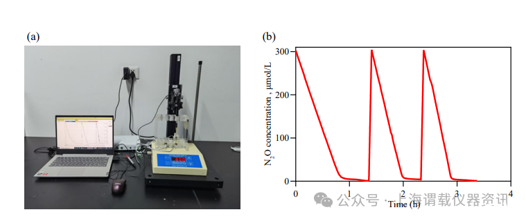 圖2、(a)unisense實時檢測N2O濃度的微呼吸系統和(b)原始N2O去除剖面示例。