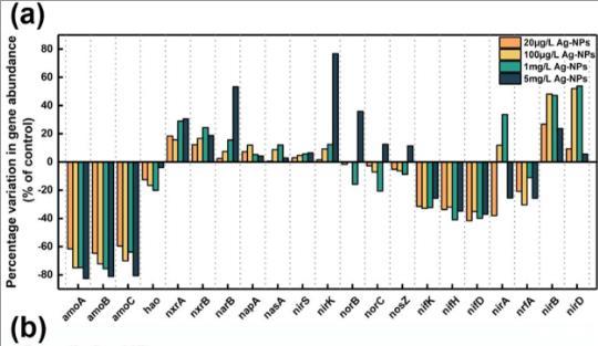 圖5、(a)參與硝化和反硝化過程的功能基因豐度的變化。(b)5 mg/L Ag-NPs脅迫下氮代謝相關基因豐度示意圖,包括硝化作用(粉色)、反硝化作用(灰色)、固氮作用(紫色)、同化亞硝酸鹽還原作用(藍色)和厭氧氨氧化作用(黃色)。綠色加號和圓圈表示上調基因,紅色減號和圓圈表示下調基因,沒有加號或減號表示未檢測到相關基因。