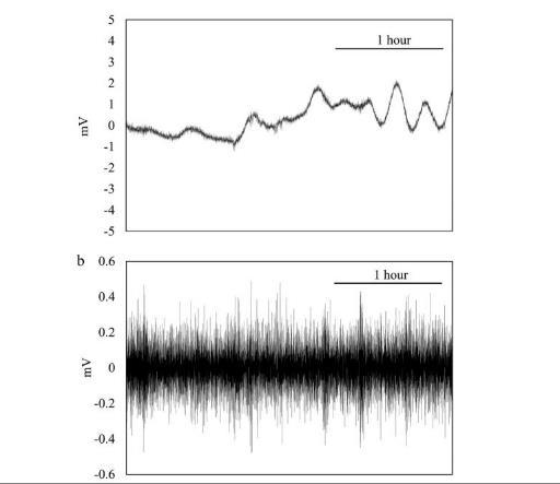 圖3、連續記錄3小時的木立蘆薈葉靜息電位的代表性圖像通過將起始靜息電位值設為0來標準化靜息電位。針對a的整個數據集計算每個相鄰數據點之間的電勢差。并與時間密謀。橫軸表示時間,縱軸表示電位。