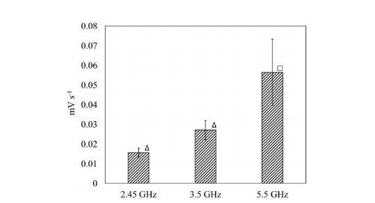 圖5、在2.45 GHz、3.5 GHz和5.5 GHz暴露下,木立蘆薈葉片火焰損傷誘導電信號中觀察到的特征電位反轉峰處的電位極化率。誤差線代表標準誤差。符號Δ和□有顯著差異。