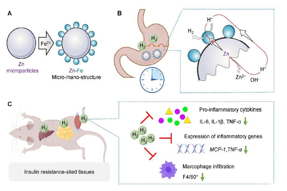 圖1、Zn-Fe原電池微納米結構的結構和構建方法示意圖(A)、加速Zn水解和H2產生的原電池原理(B)、胰島素中H2的高效積累口服Zn-Fe給藥后抵抗部位的組織支持增強抗炎和改善胰島素耐受性(C)。