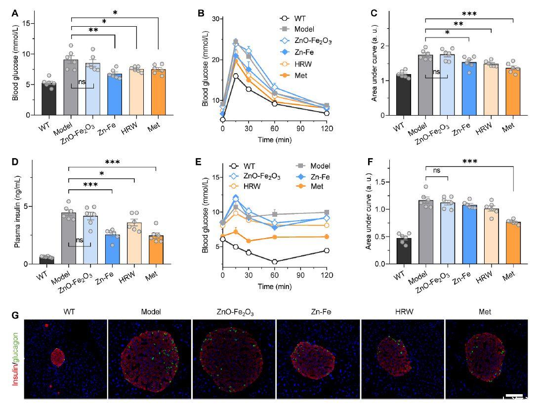 開發了一種Zn-Fe原電池微/納米顆粒,通過原電池反應在胃中具有加速酸響應H2釋放行為。通過調節Zn和Fe的比例,控制H2釋放速率,實現胃代謝時間窗內持續H 2釋放。口服Zn-Fe微米/納米顆粒在一些IR相關組織(包括肝臟、骨骼肌和白色脂肪組織)中引起相對較高的H 2濃度和H 2的長時間保留。研究發現在肥胖相關的2型糖尿病ob/ob小鼠中,這些胰島素敏感組織的炎癥受到抑制,IR得到改善。同時口服Zn-Fe微/納米顆粒顯示出較高的安全性。