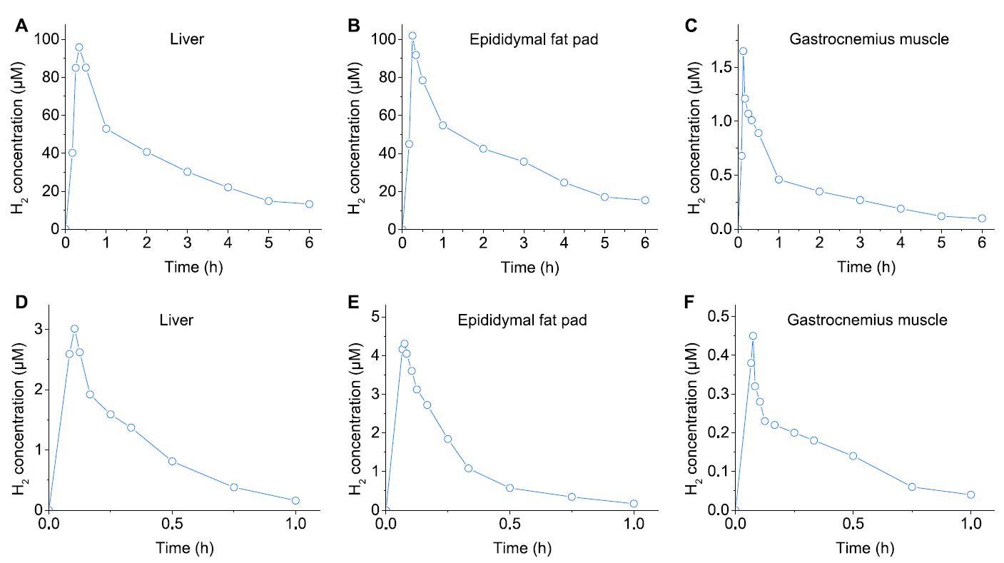 圖3、應用unisense微剖面分析系統對Fe/Zn比為1的Zn-Fe微納米顆粒灌胃后老鼠肝臟(A,D)、附睪脂肪墊(B,E)和腓腸肌(C,F)體內H2濃度的體內監測:100(200 mg/kg)(A–C)或HRW(800μM,10 mL/kg)(D–F)。