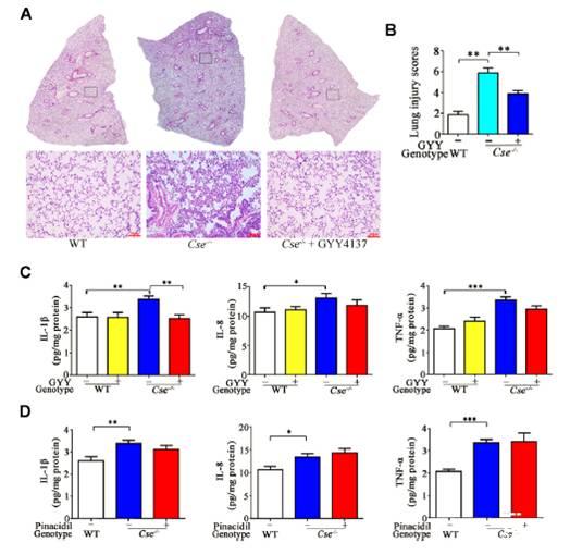 圖5、GYY4137治療可改善Cse-/-小鼠肺組織的病理改變并抑制炎癥。WT和Cse-/-小鼠用鹽水、GYY4137(50mg/kg)或吡那地爾(2.8μmol/kg)給藥。注射后24小時處死小鼠,然后收集肺組織進行形態(tài)學分析和促炎細胞因子的測定。(A)WT和Cse-/-小鼠肺組織H&E染色的代表性圖像,用鹽水或GYY4137處理。(B)、WT和Cse肺損傷評分的累積數據-/-用生理鹽水或GYY4137處理的小鼠。(C)、用鹽水或GYY4137處理的WT和Cse-/-小鼠肺組織中的IL-8、IL-1β和TNF-α水平。(D)WT和Cse-/-小鼠肺組織中的IL-8、IL-1β和TNF-α水平,生理鹽水或匹那地爾處理。