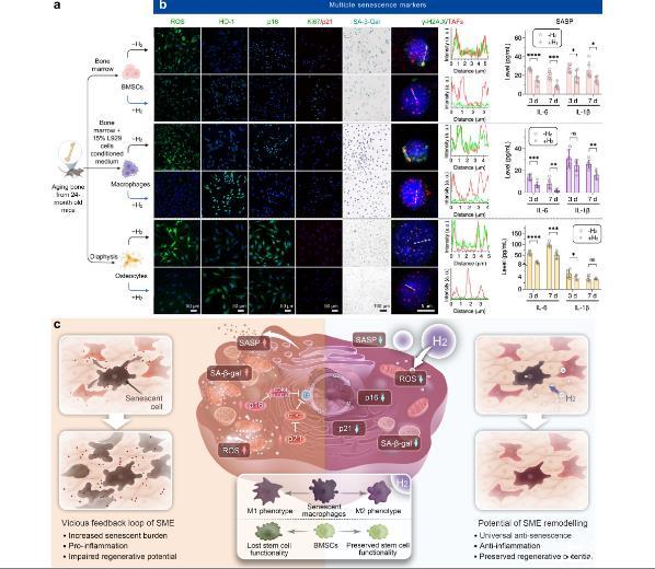 圖1、可持續H2處理衰老骨中的各種衰老細胞的體外抗炎和抗衰老行為。(a)測試持續H2治療對從老化骨骼中收集的BMSC、巨噬細胞和骨細胞的影響的示意圖;(b)代表性衰老生物標志物的測量(ROS、HO-1、p16、p21、Ki67、BMSC、巨噬細胞和骨細胞中的γ-H2A.X、TAF、SA-β-gal、IL-6和IL-1β)在有或沒有H2的情況下持續培養7天;(c)說明細胞衰老特征以及H2對SME調節的抗衰老、抗炎和再生保護作用。