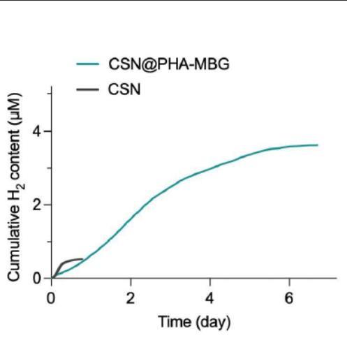 圖5、PBS中CSN PHA-MBG和CSN累積H2釋放量的定量。CSN PHA-MBG和CSN均含有等量的CSN(1mg mL-1)1).由于H2在PBS中的溶解度低,24 h內快速從CSN中釋放出來,因此H2從溶液中溢出,導致H2的累積量有顯著差異。在CSN PHA-MBG和CSN之間釋放。