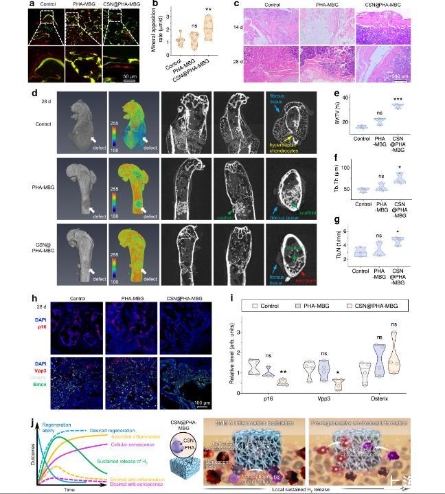 圖4、使用CSN PHA-MBG支架修復老化骨缺損的結果。(a)用鈣黃綠素(綠色)和茜素紅S(紅色)對骨形成進行連續熒光標記;(b)并對礦物質沉積率進行相應的定量分析(n=8個生物學獨立樣本),(c)對新組織進行組織學檢查第14天和第28天指定治療后的老化骨缺損部位,(d)對照、PHA-MBG或CSN PHA-MBG治療后第28天的新組織代表性SRμCT圖像;(e)相應的BV/TV量化、(f)Tb.Th和(g)Tb.N(n=3個生物學獨立樣本);(h)代表性免疫染色圖像以及(i)p16(紅色)、Vpp3(紅色)的相應量化數據)。(j)指定治療后第28天新組織中的Osterix(白色)和Emcn(綠色)表達(n=4個生物學獨立樣本,說明氫介導的損傷老化骨再生機制,其中局部和持續的H<b0>CSN PHA-MBG支架的釋放通過誘導有效的抗炎(巨噬細胞極化)和普遍的抗衰老來重塑SME,從而促進MSC的募集并保留其再生能力。
