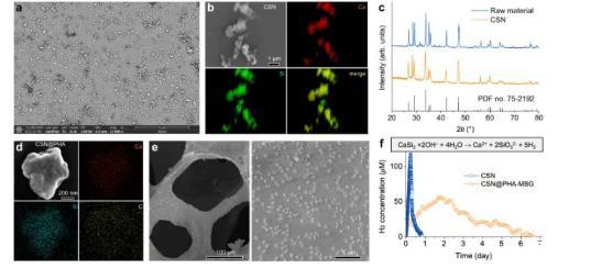 圖2、CSN和CSN PHA-MBG支架的結構和釋氫行為。CSN的代表性SEM(a)和元素映射(b)圖像、CSN和CaSi 2原材料的XRD圖譜(c)、CSN PHA的代表性SEM和元素映射圖像(d)、SEM圖像不同放大倍數的CSN PHA-MBG支架的H 2釋放曲線,以及CSN含量為1 mg·mL?1產率。所有實驗獨立重復3次,結果相似。