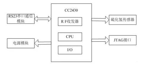 在熱處理生產(chǎn)作業(yè)過(guò)程中極易產(chǎn)生這一高危險(xiǎn)氣體。在日常生活中,硫化氫濃度較低時(shí),會(huì)造成鼻腔和眼睛的不舒服,而濃度比較高時(shí)會(huì)引起人全身的不適甚至危及生命,因此對(duì)于硫化氫的監(jiān)測(cè)變得極為重要,而在硫化氫監(jiān)測(cè)系統(tǒng)的硬件設(shè)計(jì)方面,主要由傳感器模塊、處理器模塊、無(wú)線通信模塊和電源模塊等組成,硫化氫監(jiān)測(cè)系統(tǒng)硬件結(jié)構(gòu)如圖1所示。