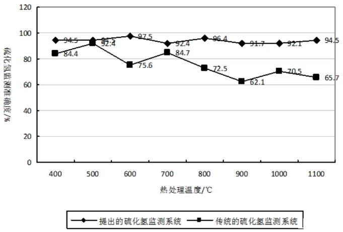 對(duì)其熱處理過(guò)程所產(chǎn)生的硫化氫,進(jìn)行監(jiān)測(cè)。并與實(shí)際的硫化氫數(shù)值進(jìn)行對(duì)比,求出兩種監(jiān)測(cè)方法,在不同熱處理溫度下的,硫化監(jiān)測(cè)準(zhǔn)確度。形成硫化氫檢監(jiān)測(cè)對(duì)比結(jié)果曲線,圖3所示。