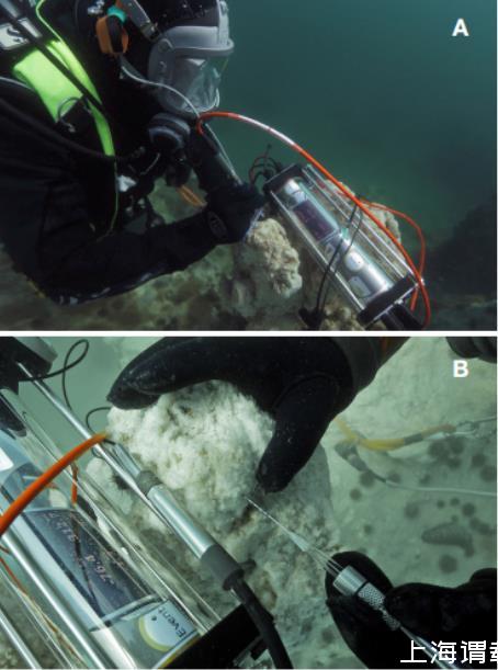 圖2|伊卡石柱。(A)潛水員在距平均海平面7米深處進行水下微剖面pH值測量。(B)近景照片顯示潛水員操作的針狀氧氣傳感器連接到水下微傳感器儀表上。潛水員使用針狀傳感器上的標記,小心地將傳感器插入多孔伊卡石基質進行測量。